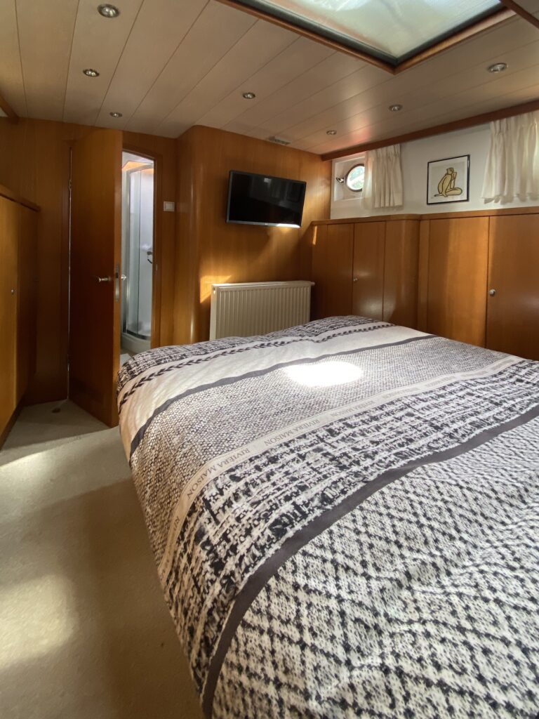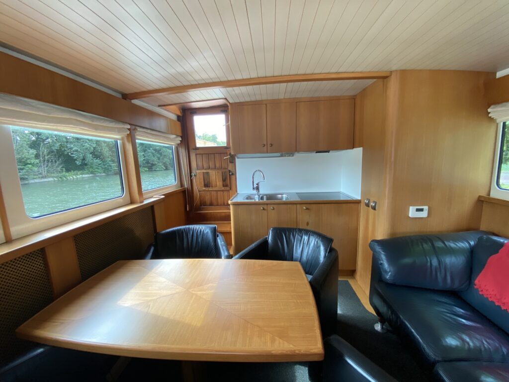 De ruime stuurhut van het schip doet tevens dienst als woonkamer. In de hoek is een bescheiden keuken gesitueerd, met een kookplaat en een koelkast. Op iets lager niveau voor in het schip bevindt zich de slaapkamer. Aansluitend aan de slaapkamer is er een badkamer, met een douche, een wastafel en een toilet. Overigens is er een tweede toilet in het schip, buitenom te bereiken.