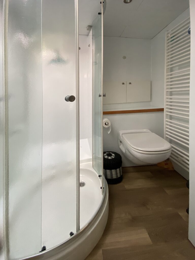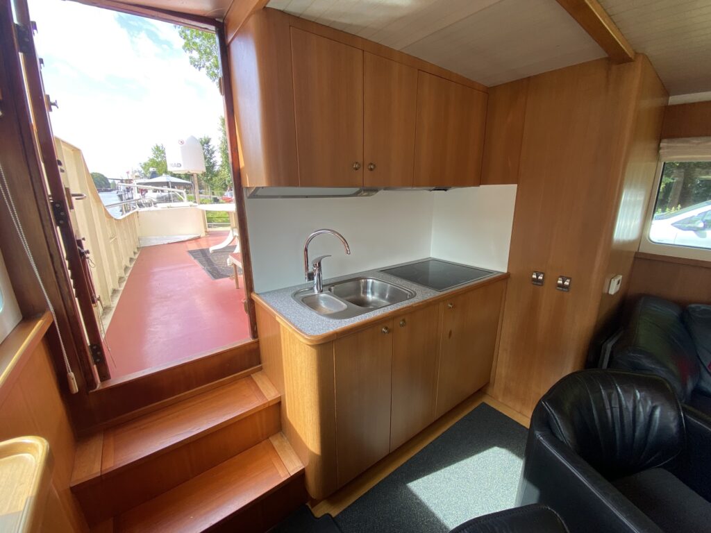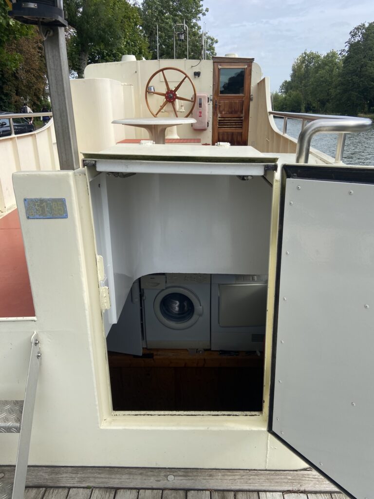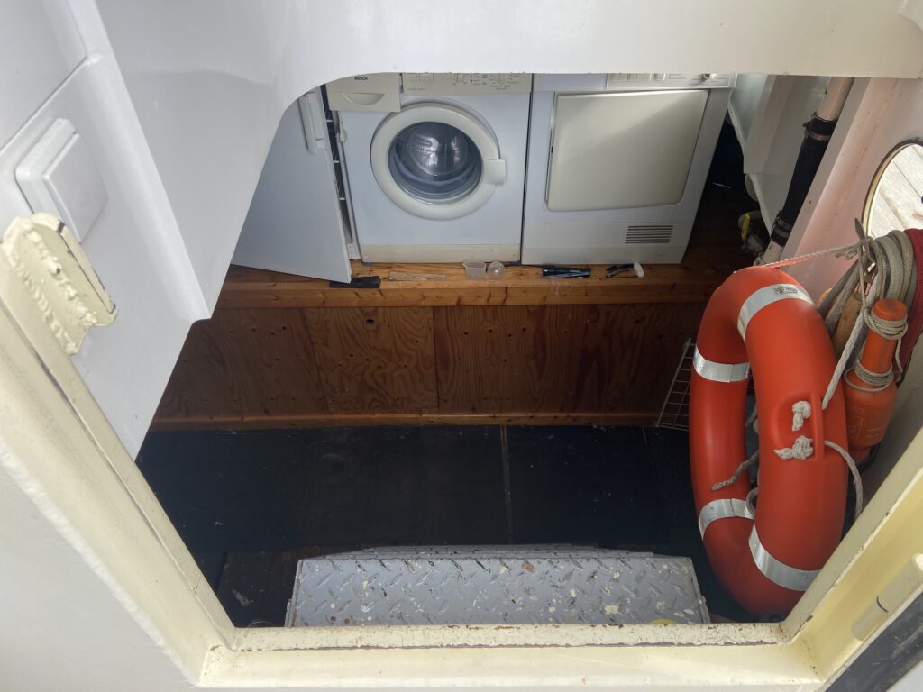 Vanaf het achterdek is een bergruimte bereikbaar waar zich onder meer een wasmachine, droger en koelkast bevinden. Alles is aanwezig voor permanent verblijf.