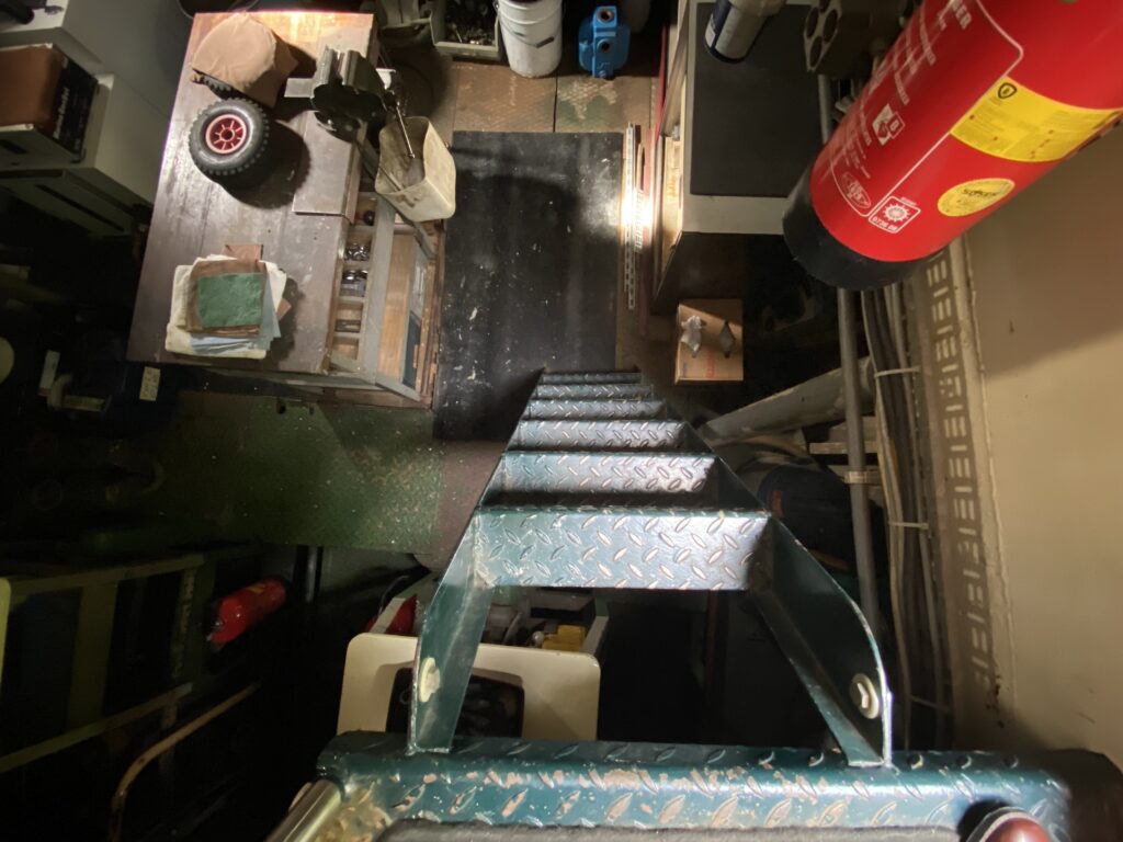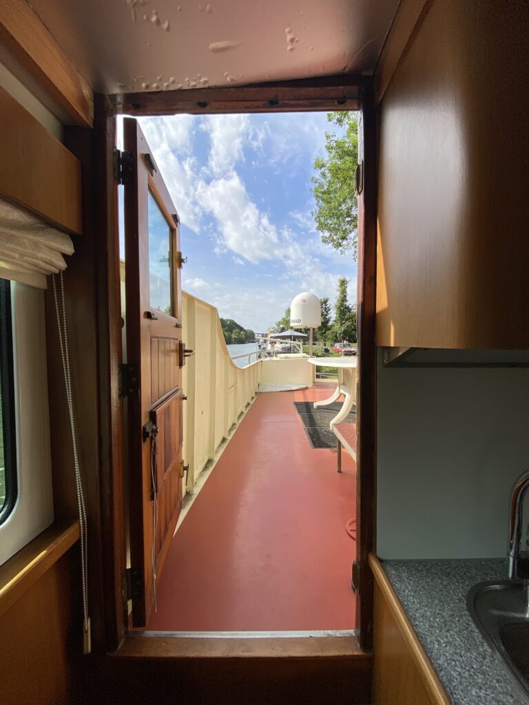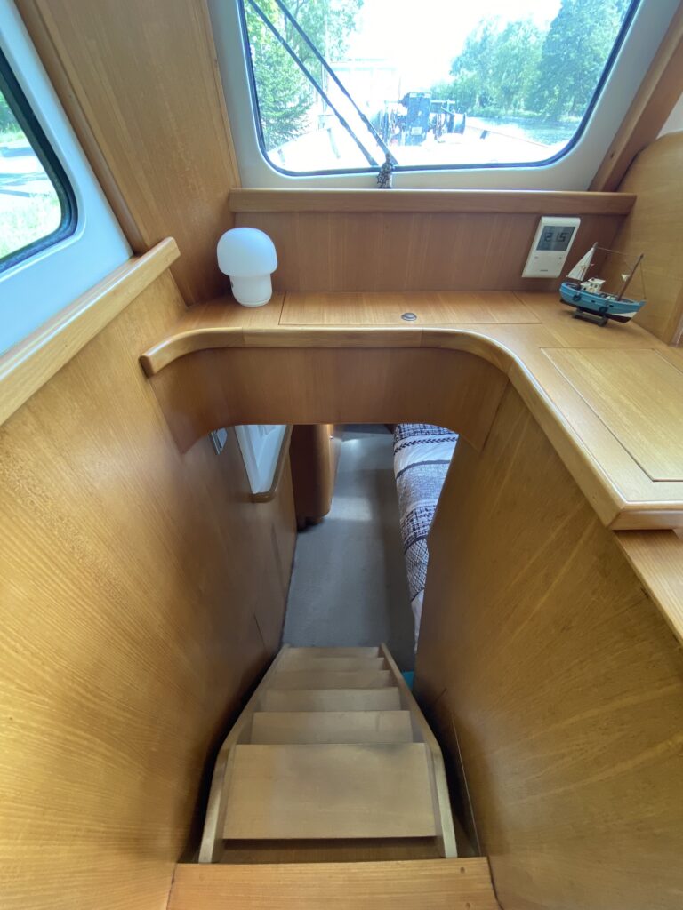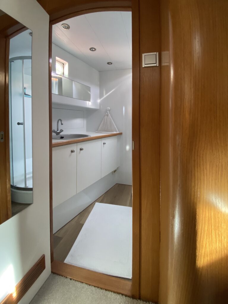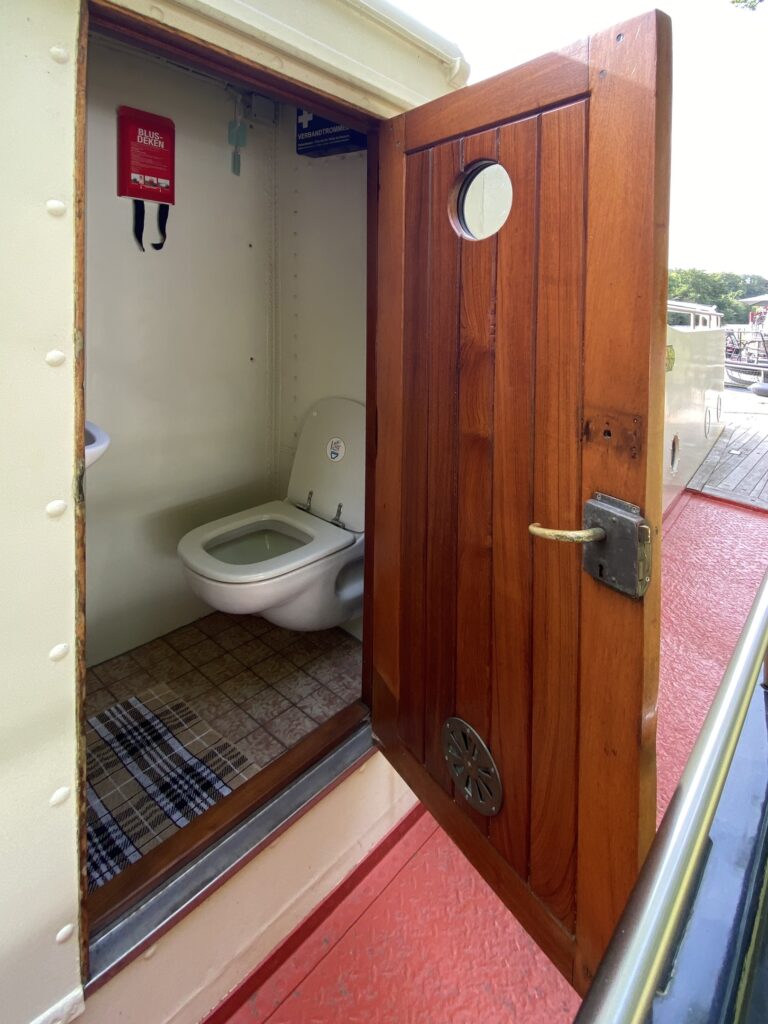 Vanaf het achterdek is een bergruimte bereikbaar waar zich onder meer een wasmachine, droger en koelkast bevinden. Alles is aanwezig voor permanent verblijf.