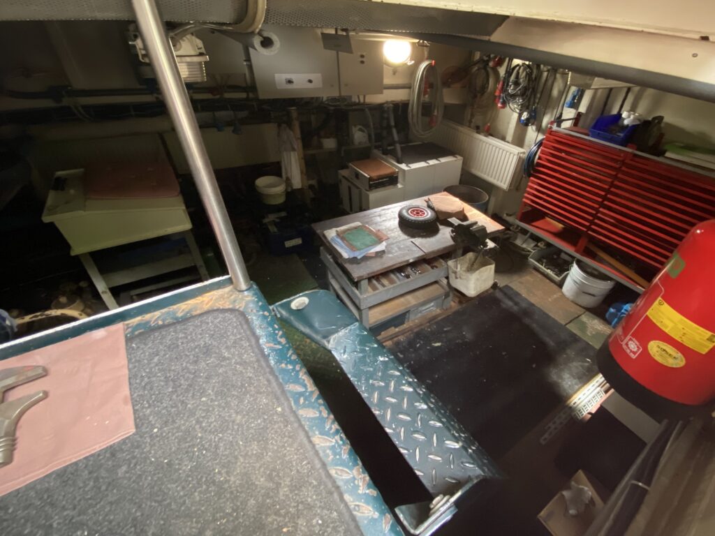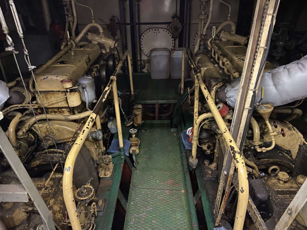 Vanuit het gangboord is via een deur de machinekamer goed bereikbaar. Daar zijn onder meer de twee motoren aanwezig. Voor de kenners: 2 stuks Deutz SA6M.
